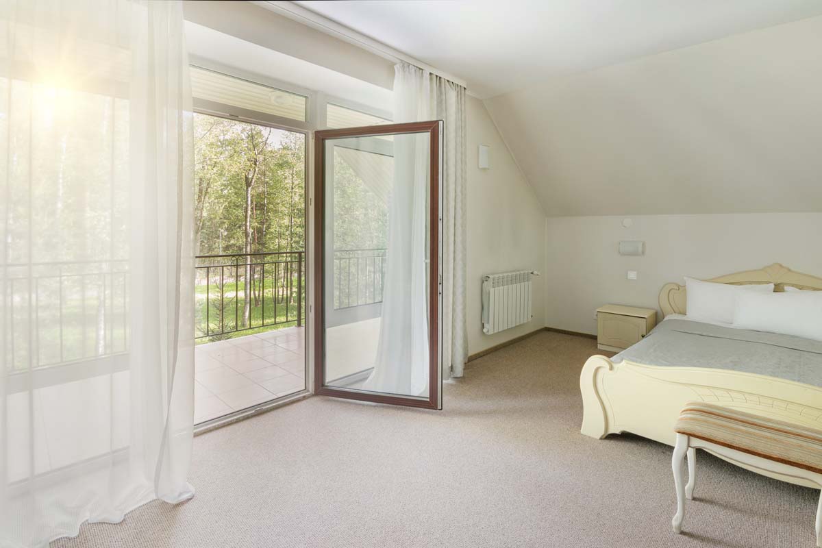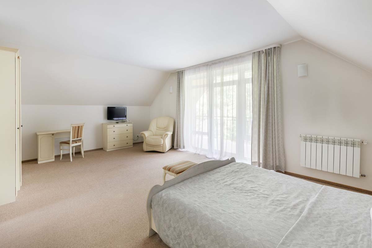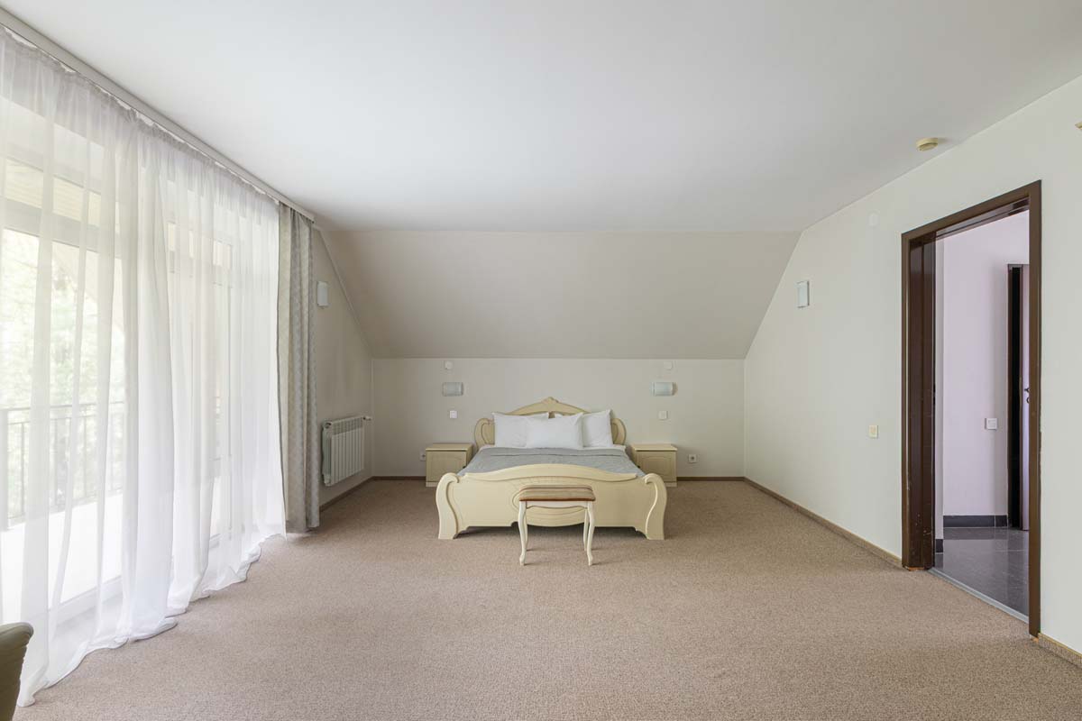 На втором этаже — просторная спальня с выходом на балкон и окнами в пол, а также еще один санузел.